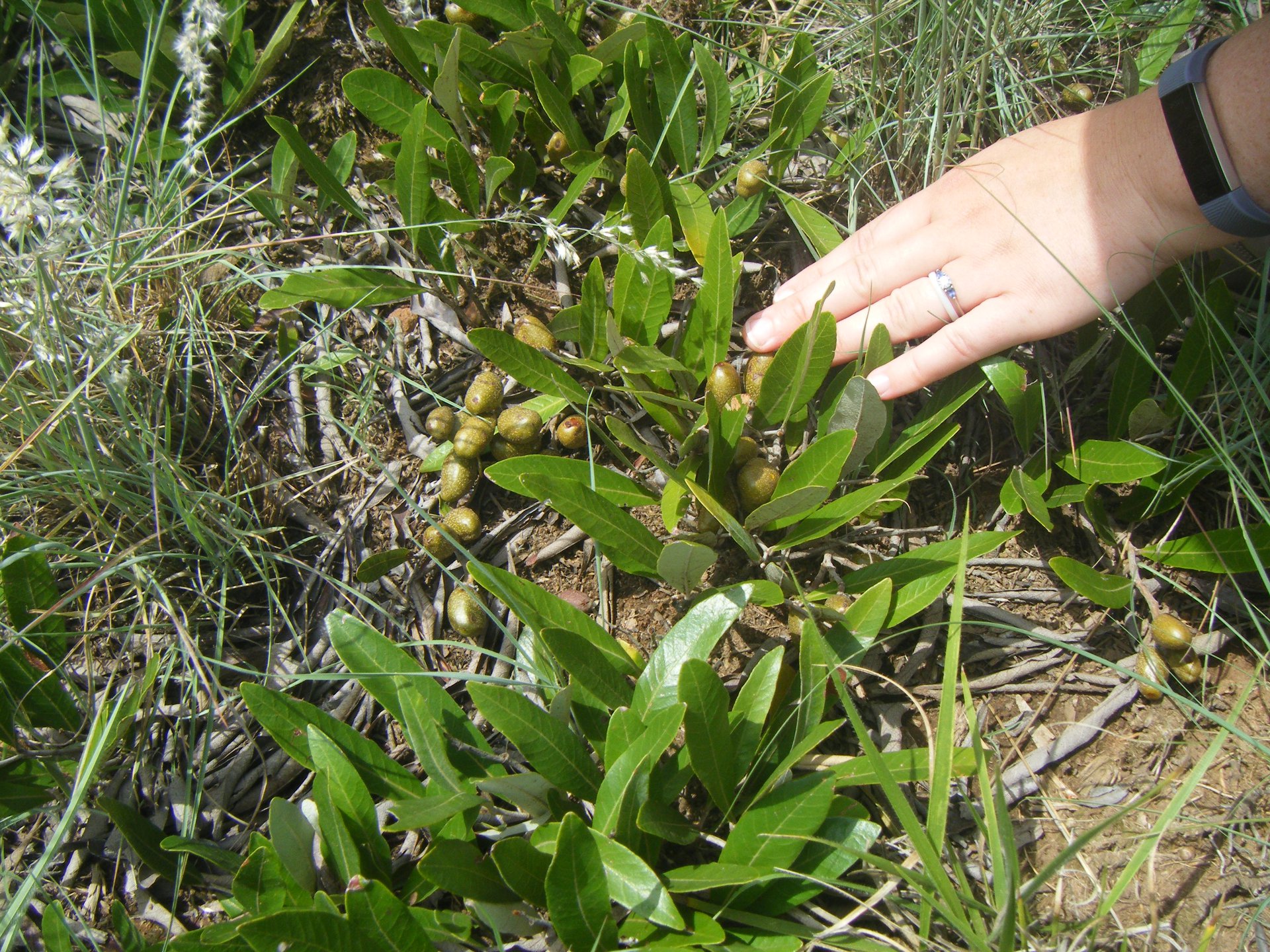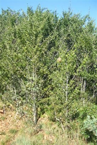 The fruit and leaves of a Canthium mundianum. The Boers reputedly made coffee by crushing the fruit - desperation? When we take people on a tour of the Koppies I try to find the stinkier things possible to crush and pass around! The fever-tea bush (Lippia javanica) is minty, the yellow everlasting (Helichrysum setosum) is strongly pungent like Zambuk. Impepho (helichrysum odoratissimum) is sweetly, muskily scented and takes visitors back to memories often with their grandmothers. My best is Velvet rock alder (Canthium gilfillianii) because it relieves cravings for morning coffee! ![]() The jerky appearance of a copse of Canthiums, all the suckering progeny of one mother plant. These indigenous trees can be become very invasive.